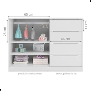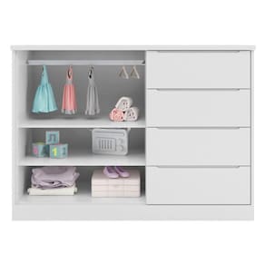 Feito em MDF. Possui 4 gavetas com corrediças telescópicas, 1 Porta, 2 prateleiras e 1 cabideiro.
