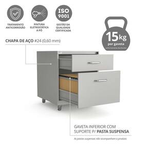1 gaveta menor porta-objetos e 1 gaveta maior c/ suporte para pastas suspensas.