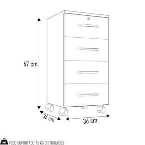 Características do Produto Material da estrutura: MDP 15mm. Material do Fundo: MDF 3mm. Acabamento: Pintura UV Texturizada. Escala de Brilho: Semi-fosco. Peso Suportado: 15 kg distribuídos cada. Quantidade de Gavetas: 4 Gavetas. Tipo de Corrediças: Telescópicas. Possui Tranca: Sim, chave. Possui Nichos: Não. Possui Pés: Sim. Tipo dos Pés: Rodízios. Material dos Pés: PVC. Material dos Puxadores: Plástico ABS. Diferenciais: - Design moderno. - 1 gaveta com chave. - Rodízios de PVC 50mm. - Ideal para a organização de diversos espaços. Sistema de Montagem: Parafusos/Cavilhas/Minifix. Manual de Montagem: Sim. Complexidade da Montagem: Média. Volumes: 2 Volumes. Conteúdo da Embalagem: 2 Gaveteiros. Garantia do Fabricante: 90 dias contra defeito de fabricação. Montagem: Recomendamos que seja feita por um profissional. Recomendação de Limpeza: Utilize pano levemente úmido.