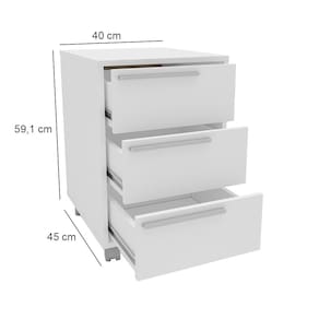 Características: Estrutura MDP Pintura UV 03 Gavetas com corrediças metálicas Puxadores em Plástico Acompanha 04 rodízios Peso suportado no Tampo: 10kg Peso suportado por Gaveta: 3kg