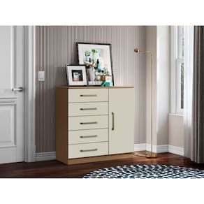 A Cômoda 5 Gavetas 1 Porta Milão Aramóveis, fabricada em MDP 15mm e 12mm de espessura. Seu espaçoso interior proporciona estabilidade ao móvel, enquanto os puxadores de plástico conferem resistência. Equipada com dobradiças metálicas, a cômoda oferece maior facilidade ao abrir e fechar as portas. O acabamento em verniz de alto brilho não apenas conserva o móvel, mas também proporciona uma estética contínua, garantindo beleza, resistência e prolongando a vida útil do produto.