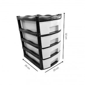 Você está comprando: 1 Gaveteiro de Plástico com 4 Gavetas Brancas 4 Gavetas Brancas Estrutura Preta Medidas 32 cm altura (com os rodízios montados) x 26 cm profundidade x 20 cm largura Medidas internas das Gavetas: 7 Cm de Altura x 27 cm de profundidade x 16 cm de largura