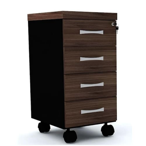 Gaveteiro volante com 4 gavetas (2 menores e 2 maiores), fabricado em madeira MDP para durabilidade e resistência. O deslizamento suave das gavetas é garantido pelo trilho corrediça. Seu corpo é construído em aço tratado com processo anti-corrosivo e reforços internos em chapas de aço, assegurando robustez. Equipado com fechadura cilíndrica tipo Yale para a primeira gaveta superior, oferecendo segurança adicional. Os puxadores ergonômicos em PVC tipo concha na cor prata proporcionam conforto no manuseio. A base conta com 4 rodízios em polipropileno para facilitar a movimentação, com travas nos 2 rodízios dianteiros para fixação precisa.