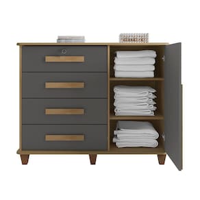 Com 4 gavetas de corrediças metálicas possui acabamento interno em linho, e puxadores em madeira nas gavetas e na porta, que conta também com dobradiças metálicas.
