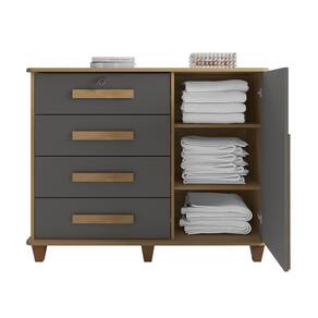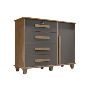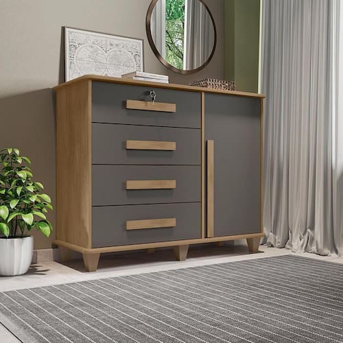 Com 4 gavetas de corrediças metálicas possui acabamento interno em linho, e puxadores em madeira nas gavetas e na porta, que conta também com dobradiças metálicas.