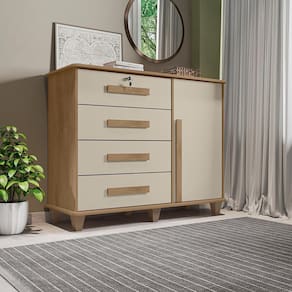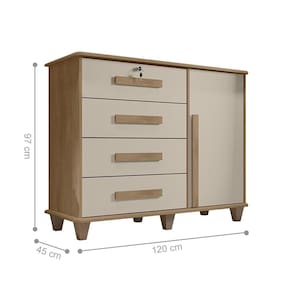 Com 4 gavetas de corrediças metálicas possui acabamento interno em linho, e puxadores em madeira nas gavetas e na porta, que conta também com dobradiças metálicas.