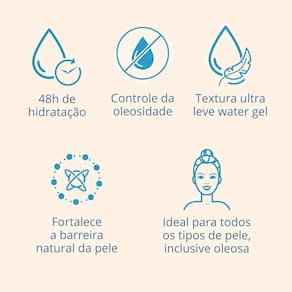 Tem um textura ultraleve, que é rapidamente absorvida pela pele e não deixa ela pegajosa. Não obstrui os poros, hipoalergênico e oil-free.