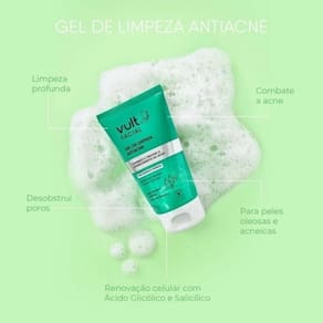 Gel de Limpeza Facial Vult Antiacne A etapa da limpeza é essencial para um skincare eficaz e com resultados. Por isso, o Gel de Limpeza Antiacne Vult Facial é o produto ideal para fazer parte da sua rotina de autocuidado. ?indicado para peles oleosas e acneicas, este gel de limpeza facial higieniza profundamente sem gerar efeito rebote na pele. Uma pele bem cuidada é tudo que sonhamos, não é? Formulado com dois tipos de ácidos, Glicólico e Salicílico, além do Extrato de Alcaçuz, esses ativos, juntos, combatem e previnem o aparecimento da acne e trazem mais benefícios: -Redução do excesso de oleosidade; -Desobstrução dos poros; -Minimização dos poros; -Sensação de pele renovada com aspecto saudável. Idealizado para uma skincare leve e prática, o Gel de Limpeza Antiacne Vult Facial vem na medida certa para você manter seus cuidados por mais tempo e de forma efetiva. Nenhum produto Vult é testado em animais, ou seja, este item possui selo Cruelty Free. Produto Vegano. Conselho de Aplicação Sempre que desejar lavar o rosto, aplique o produto na palma da mão e leve ao rosto úmido. Massageie o rosto de forma suave e enxágue em seguida. Não utilizar na área dos olhos. Durante o dia, utilize protetor solar facial FPS 30 ou maior. ?Orientações ao consumidor: Evitar exposição solar durante o uso do produto. Durante a primeira semana de uso, aplicar pequenas quantidades de produto, em dias alternados. Uma leve sensação de ardor, pinicação ou ressecamento da pele poderá ser observada nas primeiras aplicações. Não insistir no uso contínuo, caso ocorra algum efeito indesejável. Havendo irritação, suspenda o uso e procure por orientação médica. Evite contato com os olhos. Em caso de contato acidental com os olhos, enxaguar abundantemente. Não aplicar nas pálpebras e ao redor dor olhos. Não aplique em pele irritada ou lesionada. Descontinue o uso em caso de sensibilização. Conserve o produto bem fechado, longe da luz e do calor excessivo. Não usar em crianças. Mantenha fora do alcance de crianças.