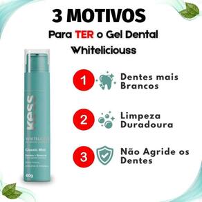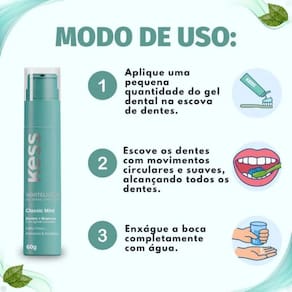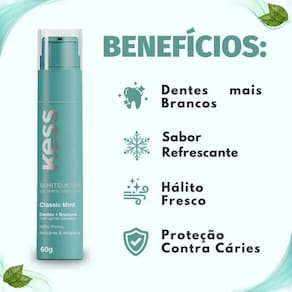 Gel Dental Kess Whitelicious Dentes Mais Brancos Classic Mint 60gDescubra o poder do Gel Dental Kess Whitelicious Dentes Mais Brancos Classic Mint 60g, a solução ideal para quem busca um sorriso mais brilhante e uma higiene bucal completa. Este gel dental inovador foi formulado para proporcionar clareamento eficaz e proteção completa para seus dentes, tudo isso com um refrescante sabor Classic Mint.Com a presença de flúor em sua composição, o Gel Dental Kess Whitelicious não apenas auxilia na remoção de manchas superficiais, mas também fortalece o esmalte dental, garantindo uma boca mais saudável e dentes visivelmente mais brancos a cada escovação. Ideal para quem busca um sorriso impecável e uma sensação de frescor duradoura.Benefícios PrincipaisProporciona dentes mais brancos e um sorriso radiante, aumentando sua confiança.Oferece proteção completa para a saúde bucal, prevenindo cáries e o tártaro.Deixa uma sensação de frescor duradoura com seu sabor Classic Mint, para um hálito agradável.Contém flúor para fortalecer o esmalte dental e prevenir cáries, protegendo seus dentes.Diferenciais do ProdutoSua textura em gel oferece uma experiência de escovação suave e eficaz, alcançando todos os cantos da boca.Desenvolvido pela BELLIZ COMPANY, sinônimo de qualidade e inovação em cuidados pessoais, garantindo resultados superiores.Embalagem prática em bisnaga plástica, ideal para o uso diário e viagens, levando o cuidado do seu sorriso para qualquer lugar.Ocasiões de Uso/Cenários IdeaisIdeal para a rotina diária de higiene bucal, garantindo frescor e limpeza após cada refeição.Perfeito para indivíduos que desejam manter ou alcançar dentes mais brancos de forma prática, antes de eventos importantes ou reuniões.Recomendado para uso contínuo, promovendo a saúde e a estética do sorriso, para um visual sempre impecável.