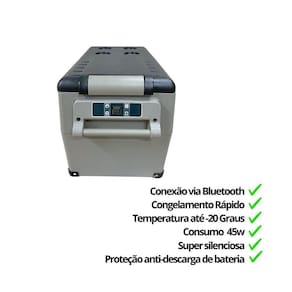 Características Gerais do produto Geladeira portátil 35 litros cometros controle via Bluetooth, quadrivolt (12v/24v, 110v/220v), metrosodo congelametrosento metrosáximetroso ou econometrosia, 1 cometrospartimetrosento metrosaior e outro metrosenor, luz de LED interna, ajuste de temetrosperatura, resfriametrosento até -20ºC, potência 45W.