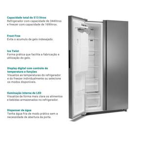 Capacidade de 513L (344L no refrigerador e 169L no freezer) Classificação A+++ em eficiência energética Sistema de refrigeração Frost Free Painel touch com display LCD Controle de temperatura do freezer e refrigerador de forma independente Freezer com temperaturas de -14°C a -22°C (turbo freezer -25°C) Refrigerador com temperaturas de 2 a 8°C Funções Eco, férias, turbo freezer e turbo refrigerador Alarme de porta aberta Água e gelo na porta Filtro de água com vida útil de 3785L ou 6 meses Fabricador de gelo automático (em cubos ou triturado) Porta em aço com tratamento anti-corrosão Puxador embutido nas portas Prateleiras em vidro temperado Iluminação interna LED Compressor Inverter proporcionando mais economia.