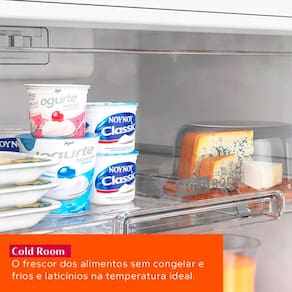 A gaveta Fresh Box cuida das frutas e legumes com carinho, mantendo tudo fresco por até 15 dias. E se você ama queijos, iogurtes e frios bem conservados, o Cold Room acerta em cheio: geladinho, sem congelar.