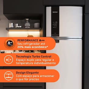 Uma geladeira moderna que traz comodidades que facilitam o dia a dia: o compartimento Turbo Control que permite gelar bebidas e sobremesas ainda mais rápido; o Espaço Adapt na porta para você armazenar itens de diversos tamanhos; e a Função Twist Ice permitindo abastecer e desenformar as formas de gelo facilmente.