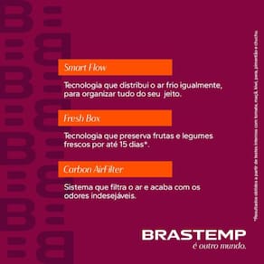 NãoA Geladeira Brastemp Frost Free Inverse A+++ 447 litros conta com a tecnologia Smart Flow, que distribui o ar frio igualmente na geladeira. Você pode organizar tudo do seu próprio jeito! Com a gaveta Fresh Box, preserve frutas e legumes frescos por até 15 dias*, e com o Carbon Air Filter, não se preocupe com odores indesejáveis. O modelo conta também com a tecnologia Safe Power, que protege sua geladeira dos picos de energia.