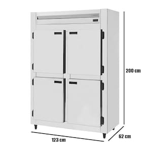 Isolamento 100% em poliuretano Revestimento externo em Inox Brilhante Revestimento inteno em Galvanizado Sistema de ar forçado (Frost Free), ecológico e econômico Portas com sistema anti-transpirante e puxadores embutidos Prateleiras reguláveis pintadas em epóxi Pés em nylon reguláveis