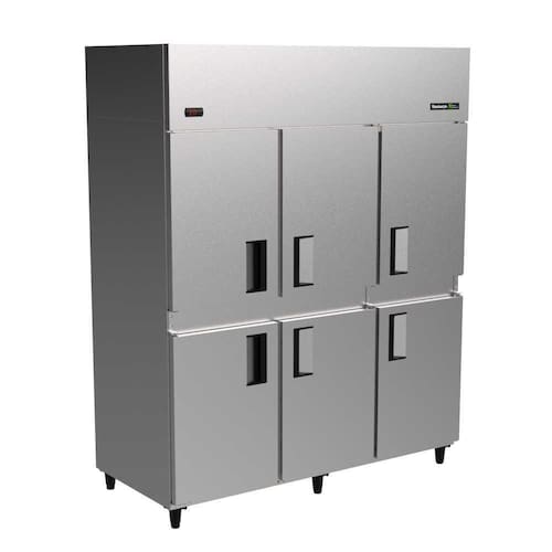 - Refrigerador destinado à refrigeração de bebidas, laticínios, frios e alimentos diversos, não congelados; - Sistema de refrigeração por ar forçado; - Equipamento contém compressor com gás refrigerante R290, fluido natural, sem impactos negativos na camada de ozônio e alta eficiência energética; - Controlador digital de temperatura, de 2 a 7 C; - Degelo automático; - Possui 3 níveis de prateleira aramada, com regulagem de altura; - Isolamento térmico em poliuretano injetado, com densidade média de 40 kg/m; Cantos sanitários, que facilitam a limpeza internas dos equipamentos; - Equipado com aquecimento de colunas; - Portas medindo 455 x 635 mm; - Revestimento interno em aluzinco; - Revestimento externo em aço inoxidável 430; - Pés plásticos com regulagem de altura, opcionalmente com rodízios.