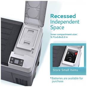 Espaço independente: Nosso refrigerador elétrico possui um pequeno espaço exclusivo, se você comprar uma bateria, ela pode ser usada como compartimento de alimentação, carregamento da bateria a bateria pode durar 6 horas após ser totalmente carregada caso não necessite da bateria da geladeira 12v, esse pequeno espaço também pode ser utilizado como caixa de zenamento multifuncional para guardar pequenos objetos como cabos de alimentação e pequenas chaves inglesas para evitar perda de itens.