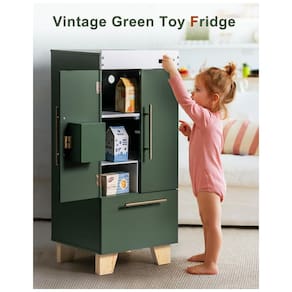 A Geladeira de Brinquedo em Verde Vintage da ROBUD é um verdadeiro destaque! Com suas portas duplas, seções superiores e inferiores perfeitas para refrigerar e congelar itens. Além dos elegantes puxadores metálicos, que proporcionam um toque retro. Mais do que um simples brinquedo, é como um item de decoração, adicionando charme ao espaço das crianças. Com espaço de sobra para guardar todos os brinquedos. Além disso, proporciona uma rica experiência interativa, permitindo que as crianças explorem a gaveta refrigerada e acessórios, com uma fatia ondulada e um simulador de espremedor de suco, estimulando a imaginação e criatividade durante o tempo de brincadeira. A linha Vintage Green da ROBUD inclui quatro produtos clássicos - forno, cozinha, máquina de lavar e geladeira - com design charmoso em verde vintage e metal requintado, perfeitos para combinar na decoração da casa. Feito de materiais de madeira certificados pela ASTM, garantindo segurança, durabilidade e estabilidade. Um presente perfeito para qualquer ocasião, medindo aproximadamente 80,5x29x81cm. Ideal para interação entre pais e filhos durante a montagem e aplicação dos adesivos.