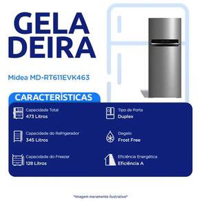Geladeira Midea 473L Frost Free Duplex MD-RT611EVK463 Para quem busca uma geladeira espaçosa com design minimalista, a Geladeira Midea 473L é a solução ideal. Com tecnologia Frost Free, ela resfria seus alimentos rapidamente e garante eficiência energética na classificação A, proporcionando mais desempenho com menor consumo. Confira mais detalhes