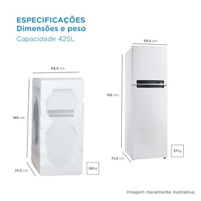 Características: Marca: Midea Modelo: MD-RT572EVD011 Consumo Aproximado de Energia: 51Kw/h Eficiência Energética: Classe A Material: Vidro + HIPS Quantidade de Portas: 2 Portas Tipo de Geladeira: Duplex Sistema de Refrigeração: Frost Free Degelo: Automático Capacidade em Litros: 425 L Capacidade do Freeezer (L): 120 Description Features:Capacidade do Refrigerador (L): 305 Eficiência Energética: A+