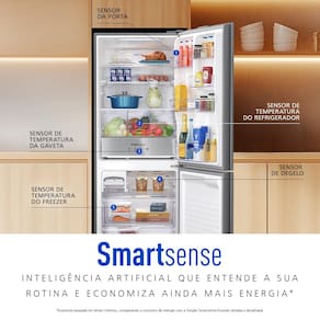 Equipada com a Tecnologia Inverter, esta geladeira garante um funcionamento extremamente silencioso, acelera o processo de congelamento e proporciona máxima economia de energia. Complementando a eficiência, o sistema Smartsense utiliza inteligência artificial para monitorar a abertura de portas e a temperatura, aprendendo a rotina da casa para otimizar o desempenho energético diariamente.