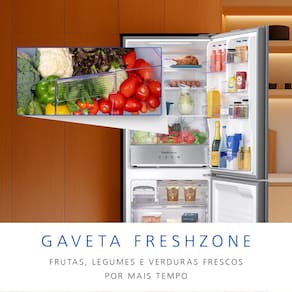 A organização e a higiene são prioridades neste modelo. O Sistema Antibacteria Ag utiliza um filtro de carbono com partículas de prata para eliminar 99,9% das bactérias, mantendo o interior livre de odores. Além disso, o freezer de 166 litros em formato de gavetas e a Gaveta Fresh Zone garantem que frutas e verduras permaneçam frescas por muito mais tempo, facilitando o acesso e a praticidade no dia a dia.