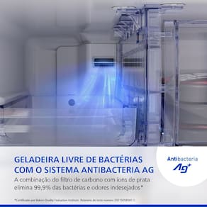Geladeira livre de bactérias com Sistema Antibacteria Ag A combinação do filtro de carbono com íons de prata age no duto durante a circulação de ar, eliminando 99,9% das bactérias³ e odores indesejados de forma eficiente e sem esforço