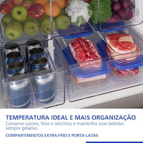 Com uma capacidade total de 475 litros, o espaço interno é otimizado para sua organização. O freezer gigante de 166 litros conta com gavetas que facilitam o acesso, enquanto o refrigerador oferece a Gaveta Fresh Zone para manter vegetais frescos por mais tempo, um Compartimento Extrafrio para laticínios e carnes em descongelamento, e um prático Porta Latas. É a tecnologia Panasonic entregando mais espaço, praticidade e frescor para os seus alimentos no dia a dia.