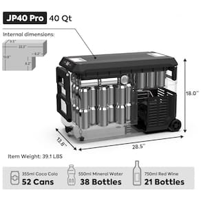 Geladeira Móvel: Com puxador e rodinhas. O refrigerador portátil JP Pro também é equipado com suportes para evitar deslizamento, para que o JP Pro possa ser estacionado com segurança em uma posição fixa. Você pode ir a qualquer lugar com a geladeira portátil JP Pro facilmente.