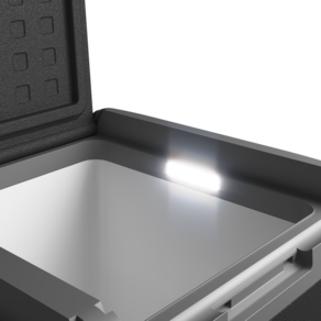 A Day2Day 50 Dark amplia o espaço interno e facilita o uso com iluminação interna, divisória removível e dreno de escoamento. Funciona em 12V/24V com fonte 110/220V, tem IPX4 e ajuste de -20°C a +20°C no painel ou no app via Bluetooth (modo ECO e MAX). Pontos laterais para cinta de fixação ajudam na estabilidade durante o transporte. Tensão: 12V e 24V, com fonte conversora 110/220V inclusa . Capacidade interna: Acomoda 73 latas (350 ml) e garrafa de 2 litros na vertical. Controle de temperatura: