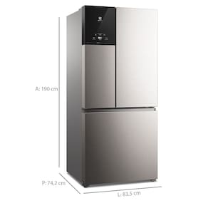 Características: Marca: Electrolux Modelo: Efficient- IM8S Capacidade total: 590 Litros Capacidade da geladeira em volume: 390 Litros Freezer: Sim Capacidade do freezer em volume: 200 litros Tipo de degelo: Frost free Painel: Eletrônico Tipo de porta: Multidoor Quantidade de portas: 3 portas Material das prateleiras da geladeira: Vidro temperado Congelador: Sim Portas reversíveis: Não Gaveta de vegetais: Sim Gaveta multiuso: Sim Controle de temperatura do refrigerador: Sim Controle de temperatura do freezer: Sim Fabricador de gelo: Sim Dispenser de água: Não Dispenser de gelo: Sim Alarme de porta aberta: Sim Luz interior: Sim Eficiência energética: A+++ Potência: 55.4 W Frequência: 60 Hz Inmetro: Sim