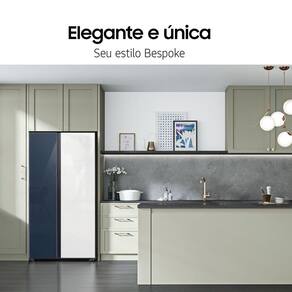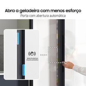 Adicione um toque de elegância que atualiza sua cozinha. O design plano minimalista, com painéis personalizáveis, combina harmoniosamente com os móveis em qualquer interior de cozinha moderna.Com um leve toque, a porta se abre automaticamente, emitindo um som e liberando a vedação para que você possa abri-lá por completo, com maior facilidade.A jarra com enchimento automático, pode ser colocada na lava-louças e você pode adicionar frutas ou ervas no infusor para criar deliciosas bebidas saborizadas. Água filtrada fresca ou aromatizada direto à mesa.Esteja preparado para qualquer ocasião com o Dual Auto Ice Maker. Um suprimento constante com dois tamanhos diferentes de gelo, o gelo em cubos e Ice Bites™, que resfriam as bebidas rapidamente. Ele produz 2,0 kg de gelo por dia e armazena até 4,1 kg total, para que você sempre tenha gelo.Guarde todos os seus alimentos de forma organizada dentro dos 590L da geladeira. A exclusiva tecnologia SpaceMax™ permite que as paredes sejam mais finas, oferecendo mais espaço sem aumentar as dimensões externas ou comprometer a eficiência energética.Tenha o controle total dos gastos e monitore o consumo de energia da sua geladeira em tempo real com a função SmartThings Energy e o modo AI Energy.Monitore e gerencie o desempenho da geladeira em qualquer lugar usando Wi-Fi integrado e o aplicativo SmartThings. Você pode controlar os modos de resfriamento, alterar a temperatura e verificar se o Dual Auto Ice Maker está ativo. Ele também alerta se a porta está aberta ou se o filtro precisa ser substituído, como também diagnostica outros problemas.A prateleira deslizante tem metade do tamanho das prateleiras fixas e pode deslizar para trás para criar mais espaço entre as outras prateleiras para armazenar garrafas altas, recipientes e itens grandes.Com o toque de um botão, o Power Cool injeta ar frio na geladeira para resfriar rapidamente alimentos e bebidas. Já o Power Freeze injeta uma rajada de ar frio no freezer, ideal para congelar alimentos e fazer gelo mais rápido.Saídas de ar estrategicamente posicionadas para manter a temperatura estável em todos os cantos da geladeira sem oscilações. Assim, a temperatura se mantém uniforme e constante, colaborando para a conservação dos alimentos.Filtro com sistema "girou, trocou", mais facilidade de instalação e praticidade na hora de trocar o refil, com um aviso que informa o momento da substiuição, mostrado no painel interno da geladeira. Além disso, os filtros originais Samsung utilizam tecnologia de filtragem por carvão, removendo até 99,7% de microplásticos contaminantes potencialmente presentes na água.A tecnologia Digital Inverter garante mais economia, maior nível de silêncio e maior durabilidade com os 20 anos de garantia no compressor.As lâmpadas de LED são econômicas e delicadas, dão beleza e iluminam cada canto da geladeira, garantindo maior visibilidade a todos os seus alimentos.