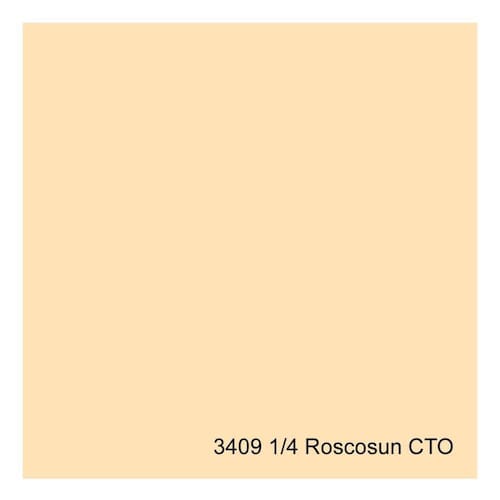 Gelatina Cinegel 3409 Roscosun Rosco 2113409 são filtros de conversão para Luz do Dia RoscoSun ÂMBAR são um arranjo de gelatinas âmbar que abaixam a temperatura de cor conforme a necessidade. Embora tipicamente usados em fontes Luz do Dia 5500F, para balancear com tungstênio, estas gelatinas oferecem uma grande variedade de possibilidades técnicas e estéticas de correção de cor.