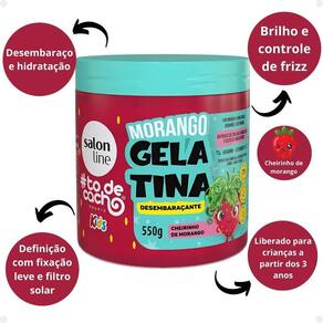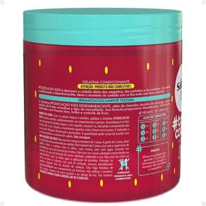 Gelatina Desembaraçante Kids Morango A Gelatina Desembaraçante Morango proporciona desembaraço, hidratação, definição com fixação leve, brilho e controle de frizz. Com filtro solar. Cheirinho docinho de morango. Testada dermatologicamente. Vegano. . Principais Ativos Extrato de frutas vermelhas: possui propriedades emolientes e nutritivas para os cabelos. Óleo de macadâmia: proporciona brilho intenso e maciez. . Modo de Uso Com os cabelos limpos e úmidos, aplique o Creme para Pentear mecha a mecha, uniformemente, no comprimento e pontas. Desembarace os fios e, em seguida, amasse-os iniciando o movimento das pontas até a raiz. NÃO ENXAGUE. . Composição Água, Poli Vinil Pirrolidona,Trietanolamina, Corante Vermelho Amaranto 16185, Corante Azul Brilhante 42090, Carbômer, Edetato Dissódico, Sulisobenzona, Glicerol, Álcool Benzílico, Gluconato de Hidroxipropilamônio, Hidroxipropilgluconamida, Sorbato de Potássio, Benzoato de Sódio, Ácido Tartárico, Óleo de Coco, Óleo Vegetal Hidrogenado, óleo da semente de Macadamia Integrifolia, Extrato de Morango, Extrato de Amora, Extrato de Framboesa, Óleo da Semente de Melancia, Poliquatérnio-55, Laurato de Sobitano PEG-80, Perfume, DiPropileno Glicol, Butilcarbamato de Iodopropinila, Etilhexilglicerina, Fenoxietanol, Cumarina, Hexil Cinamal. . Código de Registro Sanitário ANVISA 25351.377016/2024-34