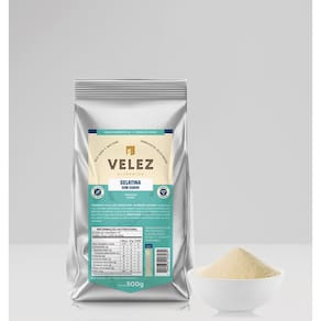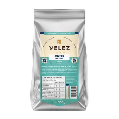 Gelatina em Pó - VELEZ Produto premium, puro, nível alimentício. Solúvel em agua a 35o. C. Gelatina é um ingrediente alimentar translúcido, incolor e insípido. Sua composição química é muito semelhante à do colágeno. É completamente digerível e contém 18 aminoácidos diferentes incluindo 8 dos 9 aminoácidos essenciais para nosso corpo, com exceção do triptofano. É especialmente rica em glicina, prolina e hidroxiprolina que juntas, representam quase 50% da composição da molécula. A gelatina é comumente Utilizado como agente gelificante, estabilizante, emulsionante, clarificante, formador de películas ou de espuma em alimentos, cápsulas de medicamentos e vitaminas, filmes e papéis fotográficos e cosméticos. Em alimentos tem suas principais aplicações em balas, gomas, marshmallows, sobremesa, iogurtes, sorvete, corbeturas e recheios, patês e requeijões e outros. Ingrediente natural e versátil que permite a criação de produtos clean label  com cor, sabor e odor neutros . Usos : Em sobremesas, bolos, doces e confeitos . Espessante em diversos preparos como coberturas e recheios. Clarificante para sucos e cerveja artesanal . Na nutrição , como suplemento rico em colágeno, fortalecimento de unhas, cartilagens, cabelo . Rico em proteinas. Peso: 500g Origem : Nacional