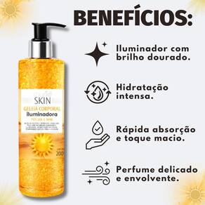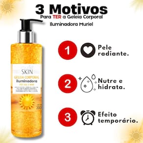 Desenvolvida especialmente para realçar a sua pele após o contato com o sol e o mar, a Geleia Corporal Iluminadora Muriel Skin Pós Sol e Mar 200ml vai muito além da nutrição e hidratação! Com uma fórmula inovadora, ela proporciona um brilho dourado e iluminado, deixando a sua pele radiante e com um toque irresistível de luminosidade. Ideal para dar aquele efeito glow temporário e perfeito para qualquer ocasião, o brilho é facilmente removido com a lavagem, permitindo que você escolha quando brilhar. Experimente a Geleia Corporal Iluminadora e sinta a diferença de uma pele nutrida, hidratada e cheia de vida!