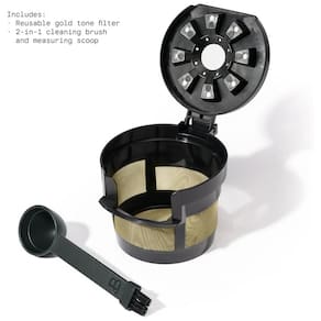 Componentes Inclusos: Cafeteira, cesta de filtro dourada, filtro de carvão e suporte, escova 2 em 1 para medidor e limpeza,