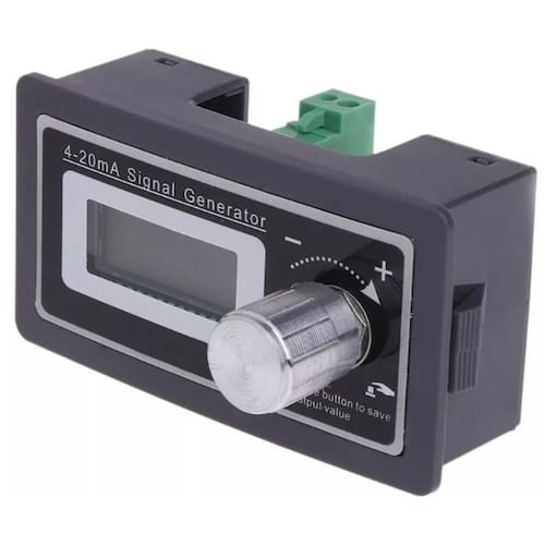 Esse componente e um Gerador de sinal analogico, com saida de 4 a 20mA, possui display LCD e potenciometro de ajuste do sinal de saida de 4 a 20mA. Possui protecao contra inversao de polaridade de alimentacao do gerador, ou seja, pode-se inverter o positivo pelo negativo na alimentacao que nao ira danificar o gerador.