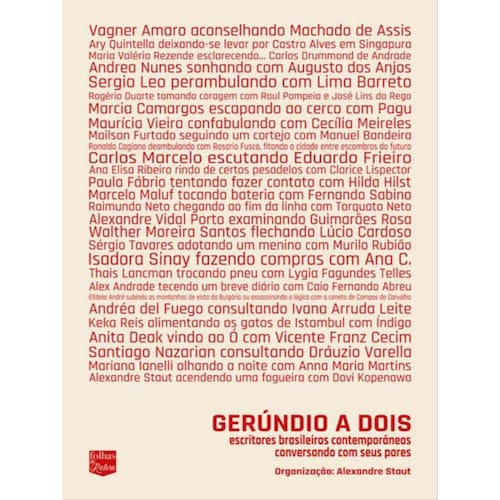 O editor da Folhas de Relva Edições Alexandre Staut convidou escritores nacionais de diversos estilos e regiões do país para a antologia de contos Gerúndio a dois, em que cada um homenageia um par - ideia que surgiu de uma série de contos publicada na São Paulo Review, revista literária ligada a esta editora, em meados da década passada. O resultado são textos sobre amizade, amor, coleguismo, sempre em clima de bom humor. Veja lista de contos: Vagner Amaro aconselhando Machado de Assis; Ary Quintella deixando-se levar por Castro Alves em Singapura; Maria Valéria Rezende esclarecendo... Carlos Drummond de Andrade; Andrea Nunes sonhando com Augusto dos Anjos; Sergio Leo perambulando com Lima Barreto; Rogério Duarte tomando coragem com Raul Pompeia e José Lins do Rego; Marcia Camargos escapando ao cerco com Pagu; Maurícia Vieira confabulando com Cecília Meireles; Mailson Furtado seguindo um cortejo com Manuel Bandeira; Ronaldo Cagiano deambulando com Rosario Fusco, fitando a cidade entre escombros do futuro; Carlos Marcelo escutando Eduardo Frieiro; Ana Elisa Ribeiro rindo de certos pesadelos com Clarice Lispector; Paula Fábrio tentando fazer contato com Hilda Hilst; Marcelo Maluf tocando bateria com Fernando Sabino; Raimundo Neto chegando ao fim da linha com Torquato Neto; Alexandre Vidal Porto examinando Guimarães Rosa; Walther Moreira Santos flechando Lúcio Cardoso; Sérgio Tavares adotando um menino com Murilo Rubião; Isadora Sinay fazendo compras com Ana C.; Thais Lancman trocando pneu com Lygia Fagundes Telles; Alex Andrade tecendo um breve diário com Caio Fernando Abreu; Eltânia André subindo as montanhas de xisto da Bulgária ou assassinando a lógica com a caneta de Campos de Carvalho; Andréa del Fuego consultando Ivana Arruda Leite; Keka Reis alimentando os gatos de Istambul com Índigo; Anita Deak vindo ao Ó com Vicente Franz Cecim; Santiago Nazarian consultando Dráuzio Varella; Mariana Ianelli olhando a noite com Anna Maria Martins; Alexandre Staut acendendo uma fogueira com Davi Kopenawa. Marca: FOLHAS DE RELVA Ean: 9786580672493