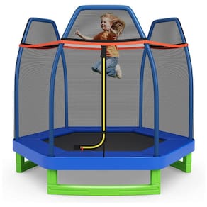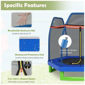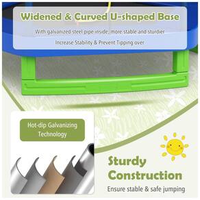 Zíper de dois lados com design de fivela O trampolim para crianças está equipado com zíper em forma de L de dois lados com fivela para garantir o fechamento duplo. Existem 36 cordas fortes para maior ressalto, maior suporte de carga e maior tempo de uso. Além disso, o tapete de salto de alta qualidade é resistente a rasgos, proporcionando proteção segura e forte ressalto. Max Load 100 kg O trampolim infantil Giantex é construído com tecnologia de galvanização a quente, garantindo uma experiência de salto estável e segura. A base em forma de U alargada e curvada, com tubo de aço galvanizado também no interior, é mais estável e resistente para aumentar a estabilidade e evitar que seus filhos tombem. Construção robusta e estável O trampolim infantil para crianças é construído por tubo de aço galvanizado a quente no interior, garantindo uma experiência de salto estável e segura. Juntamente com a base em forma de U alargada e curvada, o trampolim é mais estável e robusto e evita que os seus filhos tombe. Em conformidade com a especificação de segurança ASTM, sempre colocamos a segurança das crianças em primeiro lugar. Rede de gabinete de segurança e capa de almofada sem costura A rede de gabinete de alta qualidade é feita de PE durável e de alta densidade. Ele é instalado do lado de fora para fornecer maior área de salto para as crianças. E a almofada protetora à prova dágua cobre todas as molas e adota um design sem costura para evitar ficar preso. Além disso, a estrutura de aço superior é coberta com espuma macia para reduzir o impacto