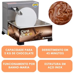 Fabricado em aço inoxidável, o Gira Choco possui disco, bica e cuba removíveis que facilitam a operação e limpeza. O Gira Choco aquece e derrete através do sistema banho-maria, garantindo a consistência e o sabor do chocolate.