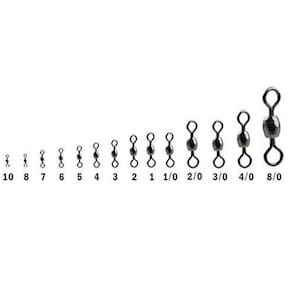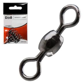 Confeccionado em metal resistente e muito útil em pesca com iscas artificiais que causam torção de linha como hélices e colheres por exemplo.