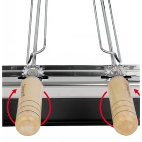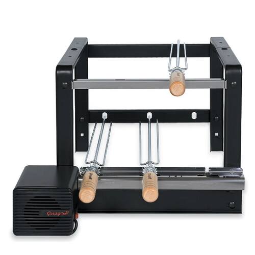 1 – ROTAÇÃO CRUZADA (os espetos giram em sentidos opostos) para evitar interferência de um espeto e outro. 2 – Apoio de espeto superior MULTIPONTO com 17 posições diferentes para girar os espetos. 3 – Armação do Kit em forma de PÓRTICO para evitar sua exposição direta sobre calor da brasa (modelos sem este recurso, têm vida útil mais curta). Tudo em aço, com pintura eletrostática. 4 – Espetos cromados com cabos em MADEIRA MARFIM.