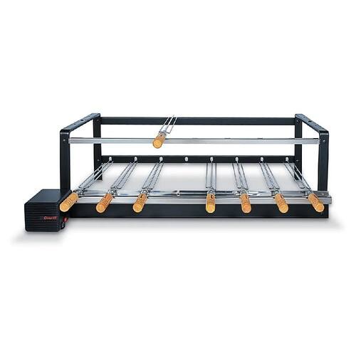 Suporte para churrasqueiras de alvenaria, apresentando 5 espetos que realizam uma rotação constante, operados por um motor elétrico que é compatível com duas voltagens diferentes.
