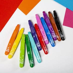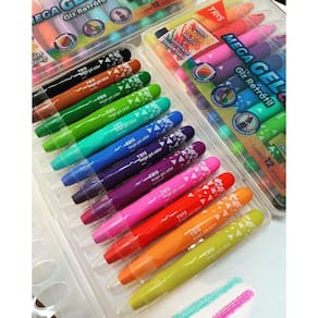 Giz Retrátil Tris Mega Gel Color, giz mega macio, excelente cobertura de cor, capa plástica protetora evita quebra e não suja a mão nem o estojo, giz retrátil, giz com cheirinho desperta o sentido das crianças, produz efeito aquarelável.