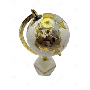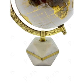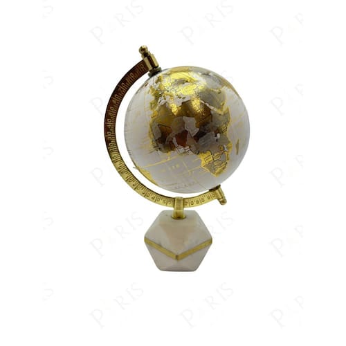 Cód: 15557-PL Globo Terrestre Decorativo em Metal e Mámore Douraod Material: Mámore Cor: Branco e Dourado Dimensões: 24x15cm (AxL) Diâmetro do Globo: Ø13cm