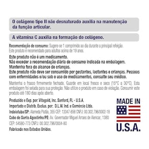 Glucosamina HCI - 750 mg Condroitina - 200 mg Metilsulfonilmetano MSM - 100 mg Colágeno Tipo II - 50 mg Ácido Hialurônico - 5 mg Vitamina C - 30 mg Recomendação de consumo: Sugere-se 1 comprimido ao dia durante a principal refeição.