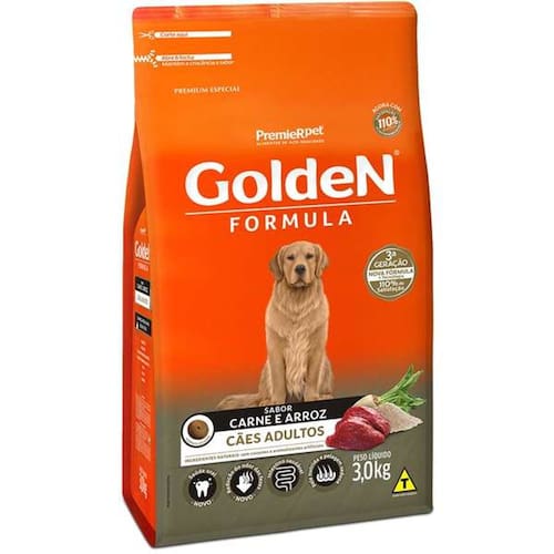 Ração Golden Cães Adultos Raça Média/Grande Carne e Arroz - 3kg- Saúde oral: auxilia a redução da formação do tártaro; - Pele nutrida e pelagem sedosa: equilíbrio de ômegas e minerais; - Redução do odor das fezes: seleção de ingredientes especiais que auxiliam na redução do odor das fezes; - Intestino saudável: combinação de nutrientes de alta digestibilidade e fibras naturais.