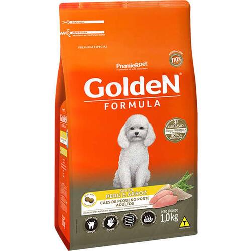 Ração Golden Cães Adultos Raça Pequena Peru e Arroz - 1kg- Saúde oral: auxilia a redução da formação do tártaro; - Pele nutrida e pelagem sedosa: equilíbrio de ômegas e minerais; - Intestino saudável: combinação de nutrientes de alta digestibilidade e fibras naturais; - Redução do odor das fezes: seleção de ingredientes especiais que auxiliam na redução do odor das fezes.