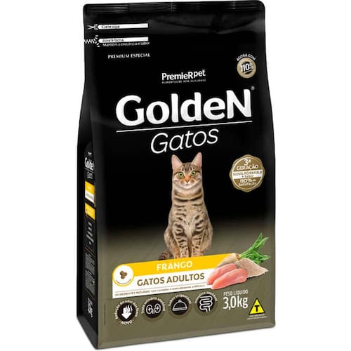 Racao Golden Gatos Adultos Frango . 3kg. Sabor inigualavel: maxima satisfacao para o paladar;. Trato urinario saudavel: minerais balanceados e controle do pH urinario;. Intestino saudavel: combinacao de ingredientes de alta digestibilidade e prebioticos;. Reducao do odor das fezes: selecao de ingredientes especiais que auxiliam na reducao do odor das fezes.